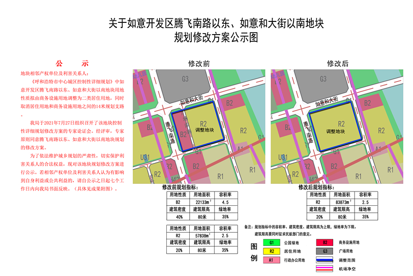据呼市自然资源局规划公示,位于赛罕区腾飞路与四纬路交汇处如意广场南侧的地块,拟由商务设施用地调整为二类居住用地,同时取消居住用地与商务设施用地之间的14米规划支路。