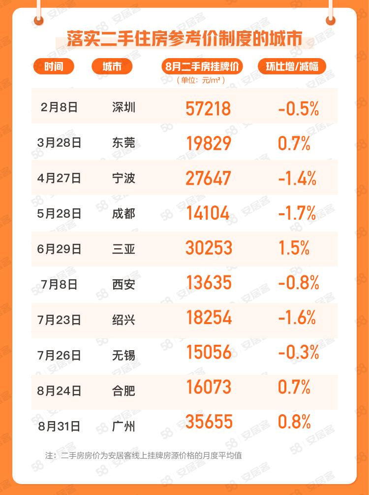 值得注意的是,目前落实二手住房参考价制度的10个城市中调控效果明显,6个城市挂牌价环比下降,成都、绍兴、宁波下降幅度分别为1.7%、1.6%、1.4%,西安降幅也达到了0.8%,深圳以0.5%的降幅紧随其后。