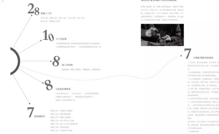 在房屋建设工程上,金地严格遵循包括主体工程,砌体工程、抹灰工程……等28道施工程序;在建筑工艺中,金地严格参考《金地集团精装工程质量验收标准及细部节点构造标准》、《金地集团成品保护标准》、《金地集团建筑防水体系》……等10大工艺标准;在工程质量验收中,金地严格按照地基验槽、隐蔽工程验收、钢筋验收、支模验收……等8项工序验收;在质量监管上,金地严格执行《项目过程评估》、《交付评估》、《供应商管理制度》、《验收与物业移交》……等8大质量管理体系;在检测程序中,从原材料工厂抽检、原材料进场检测、隐蔽工程验收,到施工单位完工初验、地产公司交付前预验收……等环节,依次遵循7道检测程序。打磨技艺,淬炼心性,金地匠人用专业敬业回报时光岁月,在每个细节处向客户演绎工匠精神的魅力。