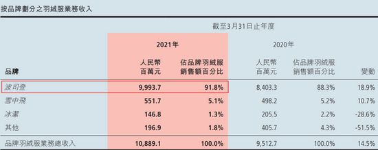 品牌羽绒服业务仍为较大收入来源,收入约为109亿元,占总收入的约80.5%,同比上升约14.5%。