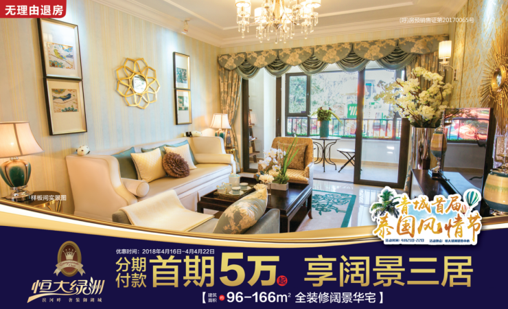 呼和浩特恒大绿洲96-166㎡湖景华宅,全装修交付!分期付款,首期仅5万起,享阔景三居!4月21日-4月22日恒大绿洲【首届青城泰国风情节】火爆登场!关注【恒大绿洲公众号】贵宾门票免费领取。