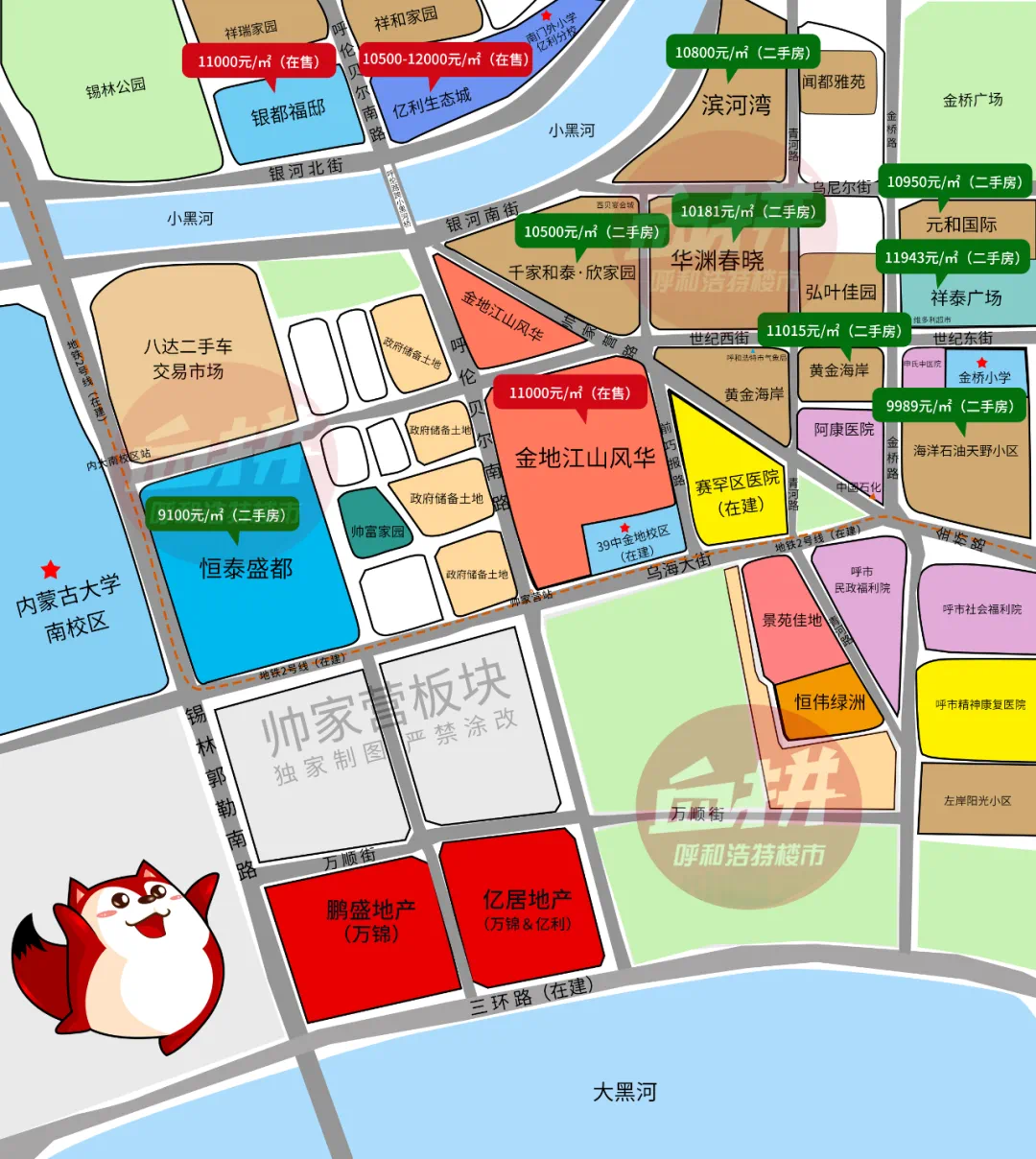 房价方面,因区域内项目多为老旧项目,部分项目房龄在10年以上,且为遗留问题项目,故而二手房价格相对较低,在10000-11000元/㎡之间,部分楼盘下探到9000元/㎡上下;新房方面临近帅家营板块小黑河北岸的亿利生态城、银都福邸和小黑河南岸的金地江山风华价格几乎持平,当前价格均在11000元上下,不过最初开盘之时也均是9字头起步,吸引了众多刚需客户,相比其他热区,帅家营板块价格略有优势,是典型的宜上车区域。血拼哥认为帅家营当前也没有必要争夺王者之位,利用好自己的交通,教育,医疗配套资源,自成生态体系,目标客群明确,也是不错的打法,未来随配套完善,升值潜力较大。
