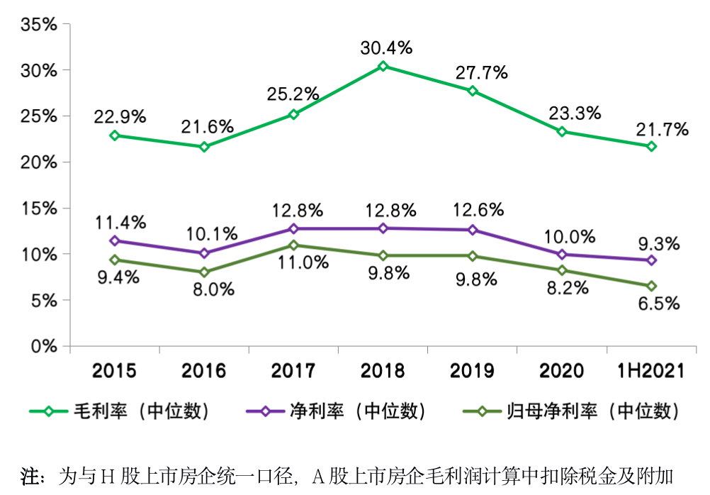 CRIC数据显示,今年上半年80家典型上市房企毛利率中位数仅为21.7%,同比降低1.6个百分点。净利率和归母净利率中位数分别降低0.6和1.7个百分点至9.3%和6.5%。三大核心指标均呈现下行趋势,上半年降幅较2020年进一步扩大。