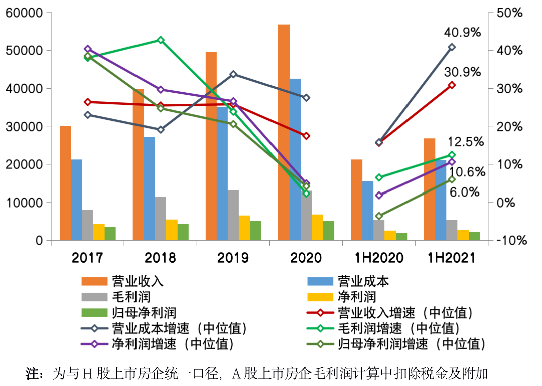 2021年上半年,CRIC监测的80家典型上市房企整体实现营收收入26839亿元、营业成本21039亿元,营收和营业成本的增速中位值分别为30.9%和40.9%。