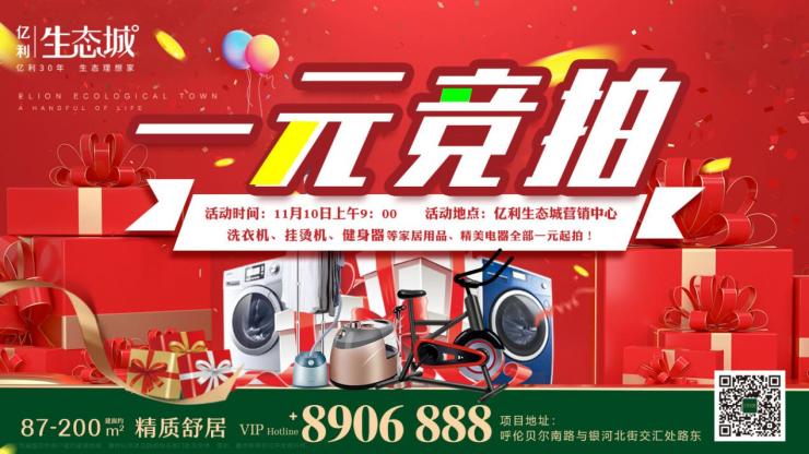 双十一大战即将来袭,离吃土的日子又不远了,在大型“剁手”现场来临之际,亿利生态城本周日将上演一场与众不同的狂欢——品牌家电1元竞拍大会。