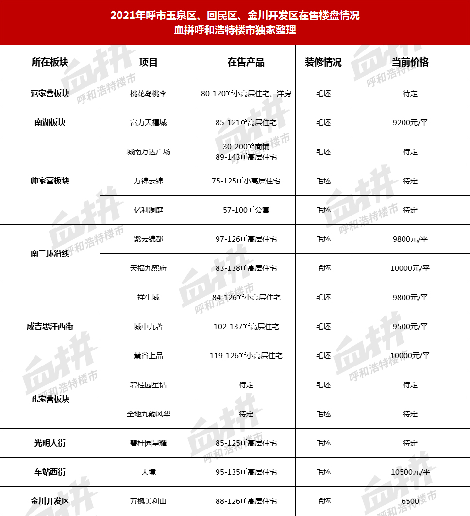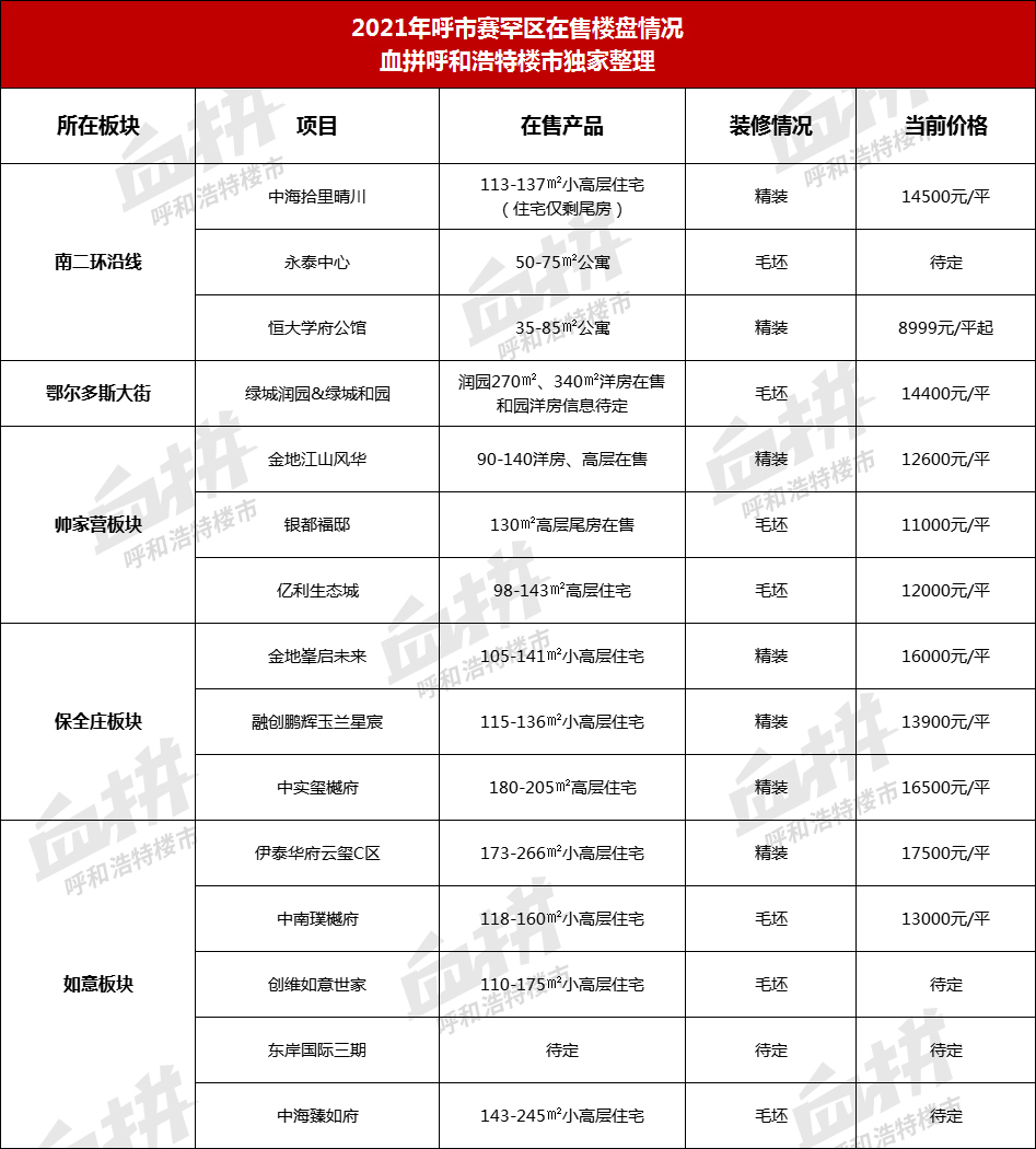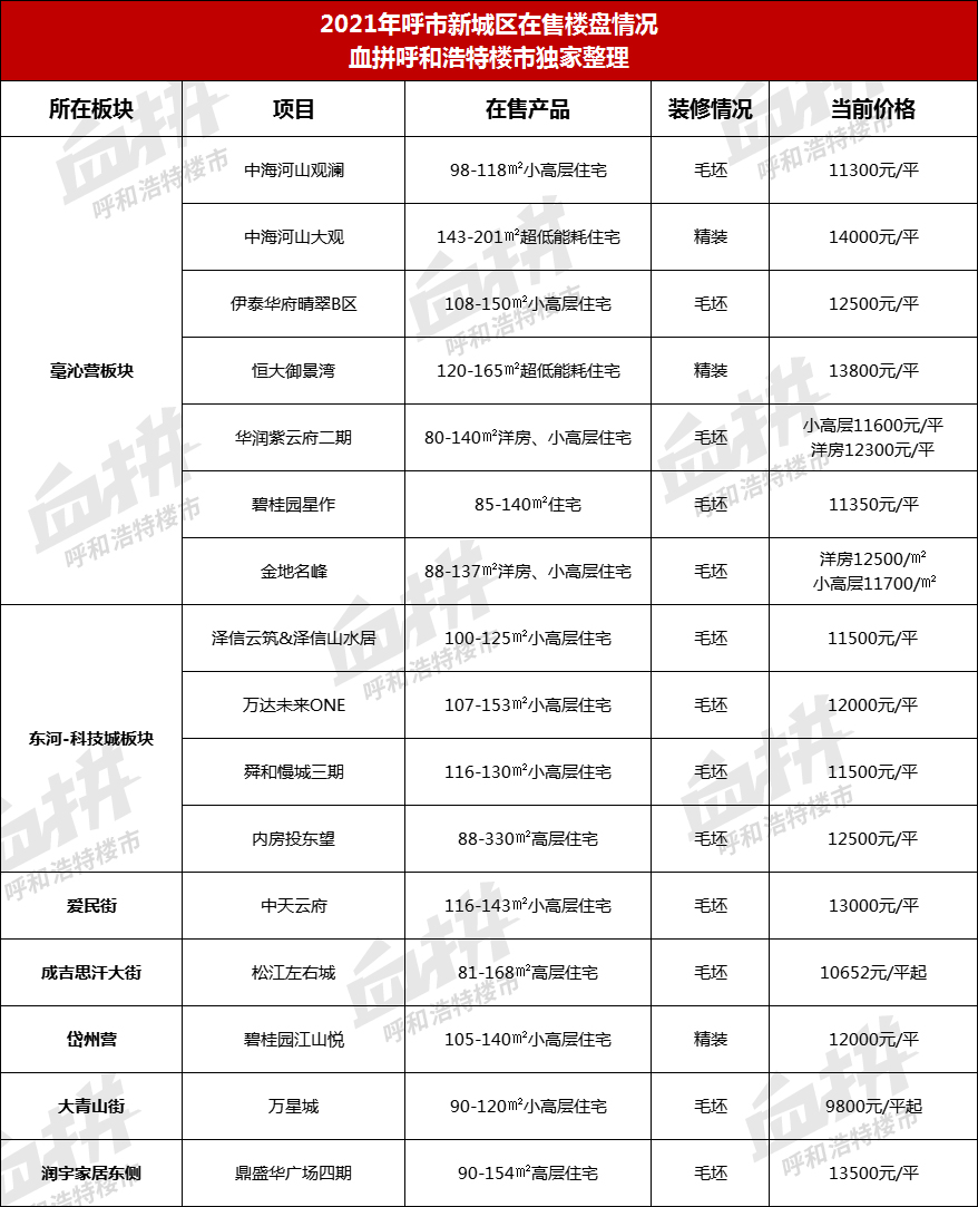 血拼哥不完全统计,2021年呼市四大主城区主要在售项目共计46个,半数以上是纯新盘,血拼哥整理各区域在售新盘的较新报价,带你一探究竟,为后续买房置业作参考,本文信息量较大,建议先收藏后看!