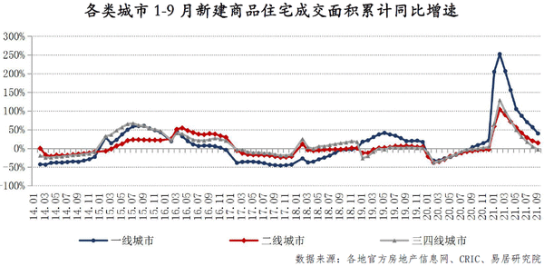 从各类城市表现来看,一、二、三四线城市1-9月新建商品住宅累计成交同比增速均收窄,增速依次为39.8%、14.5%、-2.9%,较上月分别收窄16.9、5.6、8.1个百分点。报告预计,在调控加持下未来几个月三类城市都将继续降温,但速度可能有不同程度放缓。