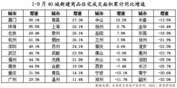 报告显示,1-9月份40城新建商品住宅累计成交面积同比增长11.4%,增速较上月回落7.2个百分点,已连续6个月回落。在当前严厉的调控背景下,预计40 城新建商品住宅成交面积年初累计同比增速将继续回落。