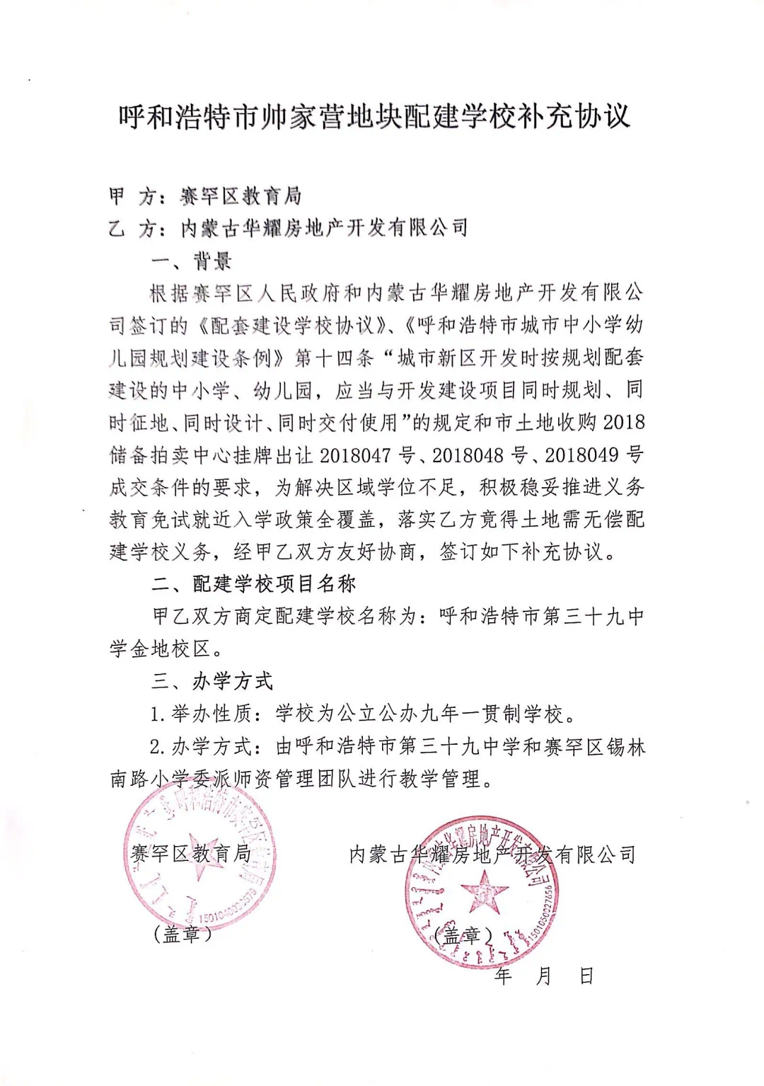5月15日,39中金地校区正式开工奠基,为帅家营板块吸引力加码。该校是九年一贯制公立公办学校,为2018年12月帅家营地块土拍时要求开发商配建的小学中学,金地集团竞得土地后无偿配建,建成后由第三十九中学和锡林南路小学委派师资管理团队进行教学管理。