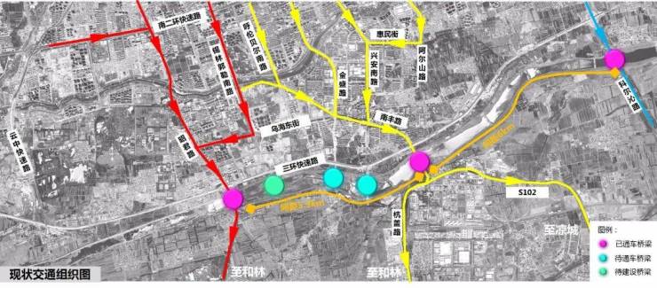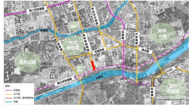兴安南路及跨大黑河桥工程, 南起大黑河桥南侧 S102省道,北至世纪大街,全长3.094 公里(其中,跨大黑河桥全长 695米),道路等级为城市主干路。项目的建成通车,可实现兴安南路与兴安南路跨大黑河桥、 三环快速路的贯通与连接, 拓宽城市南向发展通道;同时, 向南延伸至 S103省道,与金盛路连接,可有效分担部分昭乌达哲里木路高架、南丰桥的交通压力,进一步实现“南联”沙尔沁、云谷、空港、和林格尔乳业4个片区;再者,与轨道交通二号线喇嘛营站互通, 优先解决了人民群众最关心的便民畅通出行问题,使群众前往大黑河郊野公园休憩游玩更为便捷。