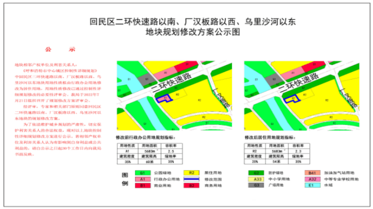 回民区二环快速路以南、长汉板路以西、乌里沙河以东地块性质,拟由行政办公用地修改为居住用地。用地面积5683㎡,修改后容积率2.3,绿化率35%,建筑密度20%。
