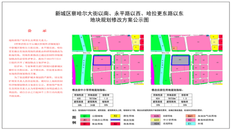 新城区察哈尔大街以南、永平路以西、哈拉更东路以东地块用地性质,拟由科研用地修改为机场用地。