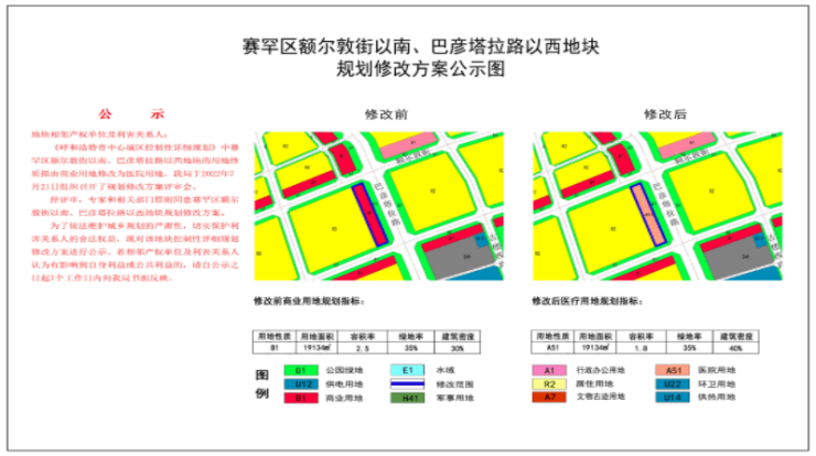 赛罕区额尔顿街以南、巴彦塔拉路以西地块的用地性质,拟由商业用地修改为医院用地,面积19134㎡,修改后容积率1.8。
