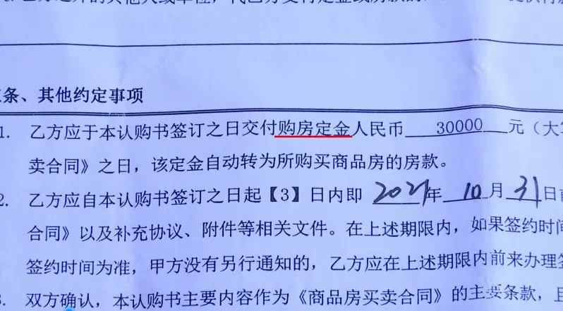 双方各执己见,没有讨论出结果。但记者看到,收据和认购书中提到的定金却是两个字。索女士说,这两个字不同也影响了退款问题。