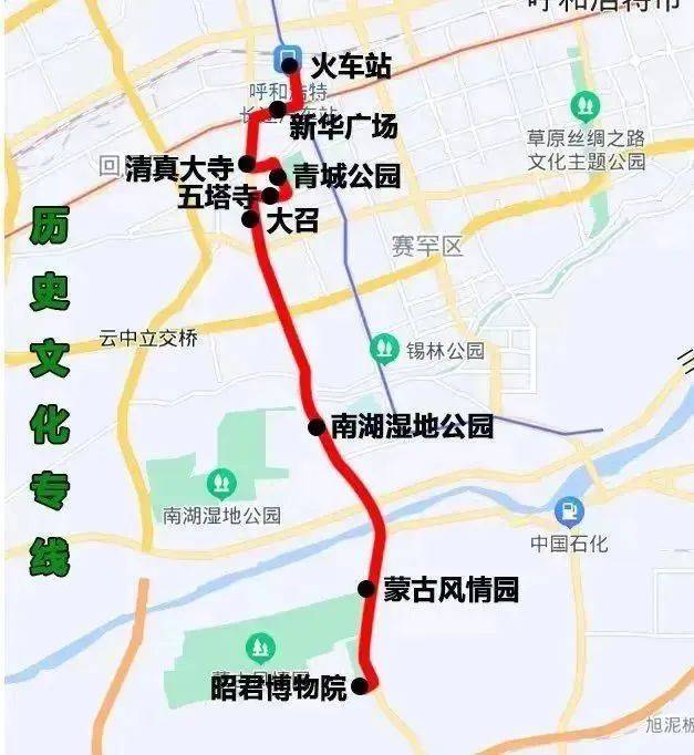 沿途设站:火车站、新华广场、青城公园、五塔寺、大召、南湖湿地公园、蒙古风情园、昭君博物院