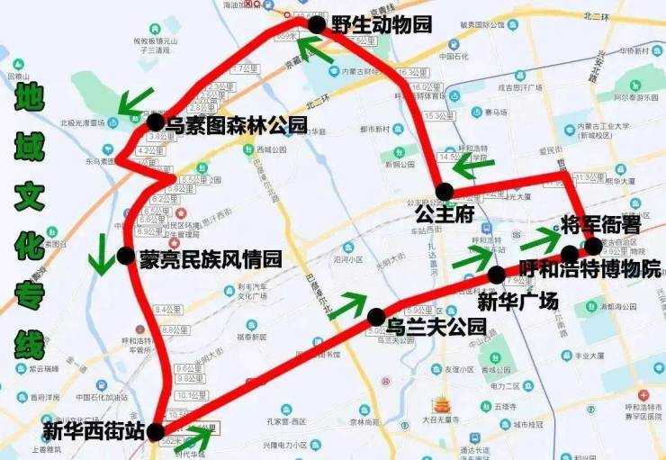 沿途设站:新华西街站、乌兰夫公园、新华广场、呼和浩特博物院、将军衙署、公主府、野生动物园、乌素图森林公园、蒙亮民族风情园