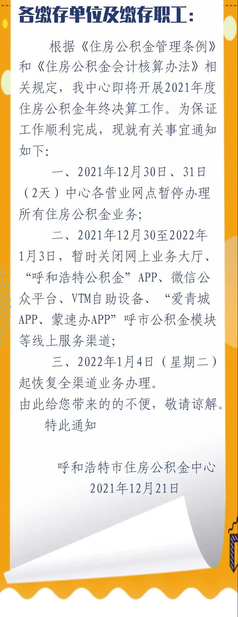 呼和浩特公积金中心发布消息,12月30日、31日,暂停办理业务。