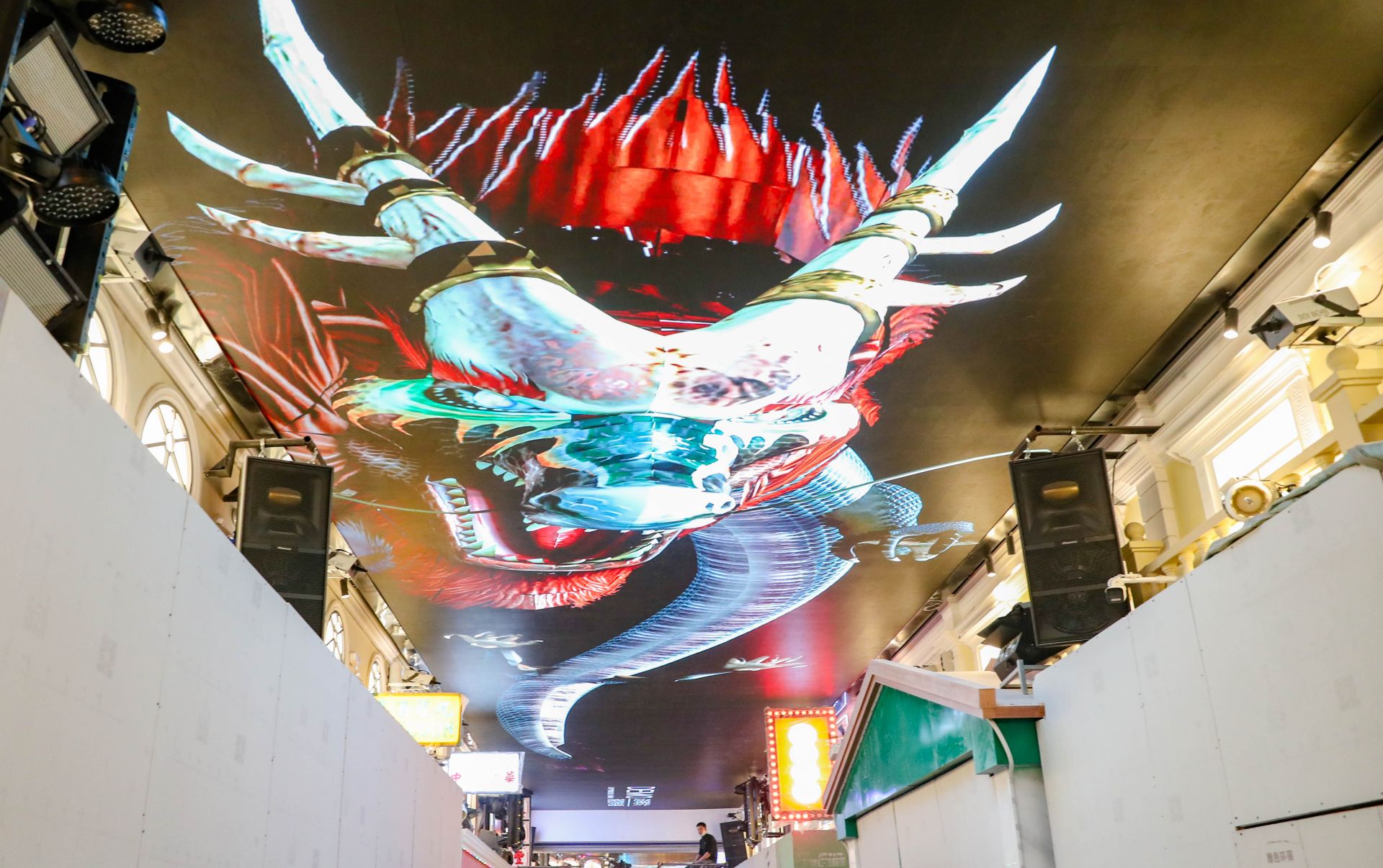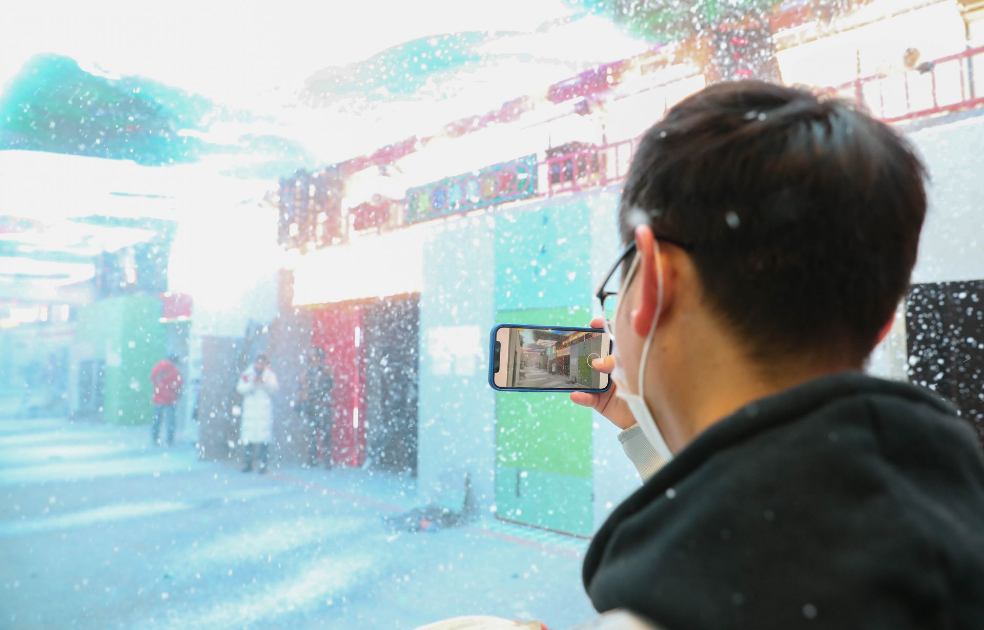 当日,在呼和浩特地铁网红巨型天幕街区,记者看到了神奇的室内飘雪景象,这一街区最值得打卡之处,就在于屋顶的巨型LED以及配套的音效和实景。LED会不停地播放特定动画场景,例如游走的中国龙,金鳞灿灿,威严震撼,其视觉效果如同裸眼3D,十分逼真。例如春夏秋冬的四季更迭,每当荧幕变换到冬季,现场就会飘出由泡沫仿制的纷飞雪花,再加上环绕立体声效,让游人随时感受室内雪景的曼妙。再例如动感跃动场景,多彩皮球蹦跳在屏上,镭射光效乍现,加上现场DJ的互动,能让您感受众人齐舞的欢乐。据呼和浩特地铁网红街建设单位工作人员吴柳佳介绍:“面向市民开放后,巨型天幕的室内雪景泡沫将设定为一小时喷洒一次,若人流量较大,会调整为半小时一次,每次喷洒将持续40秒钟左右。”
