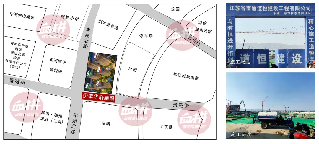 项目地处景苑街与丰州北路交汇处东北方向,整体位于毫沁营板块的南侧,占地41.166亩,规划地上建筑共8栋,1栋商业,1栋物业用房,其余6栋为住宅,其中住宅四栋18层,2栋23层,规划397户,户型面积约108㎡、136㎡、151㎡,现在售楼部样板间已经开放,位于伊泰华府世家售楼部原址,项目工地已经挖槽开工。