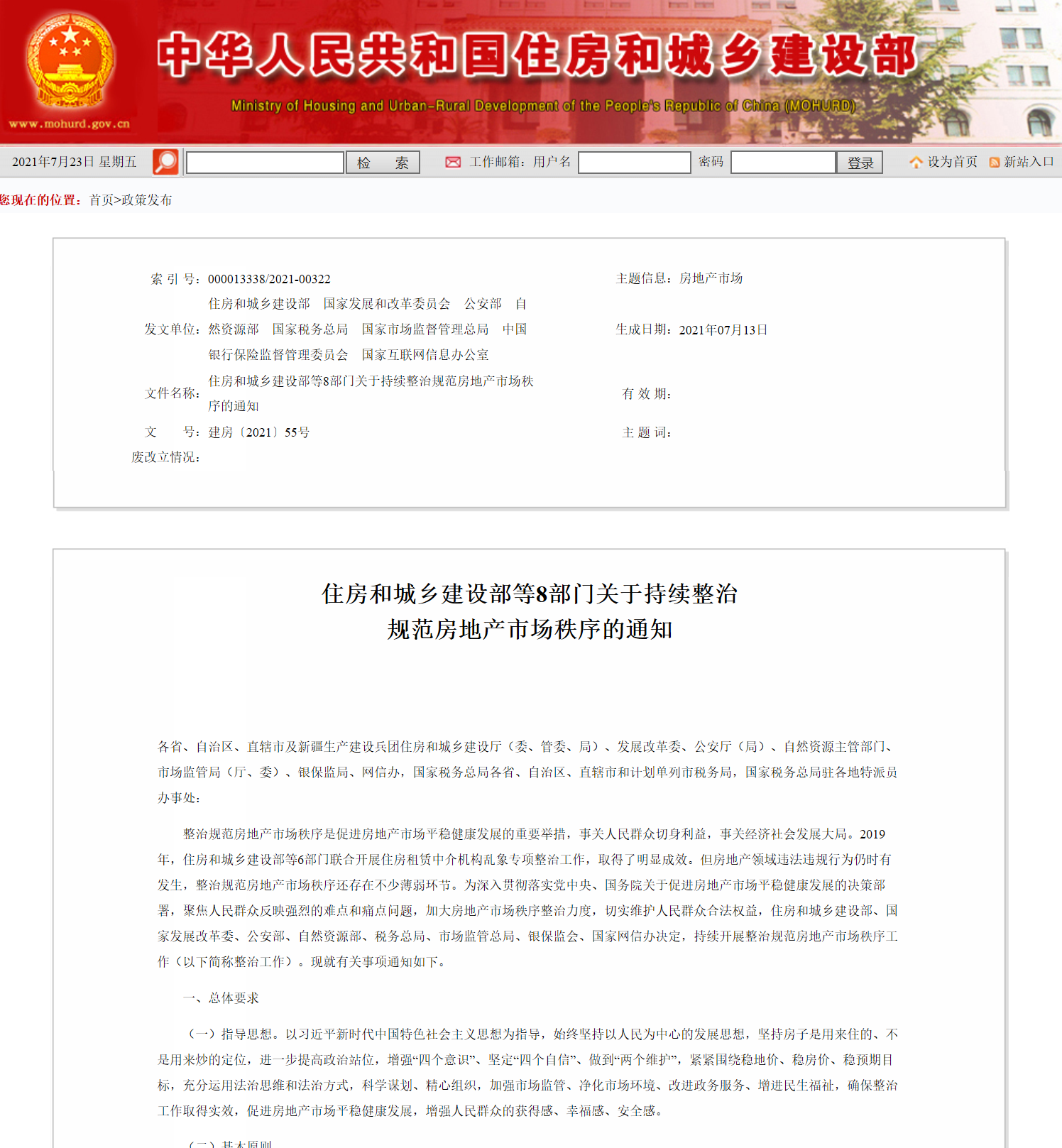 住建部等8部门发布关于持续整治规范房地产市场秩序的通知
