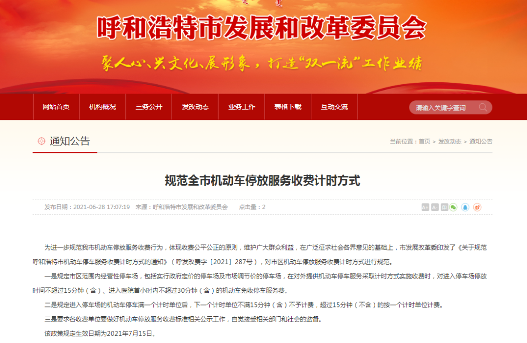 为进一步规范呼和浩特市机动车停放服务收费行为,体现收费公平公正的原则,维护广大群众利益,在广泛征求社会各界意见的基础上,市发展改革委印发了《关于规范呼和浩特市机动车停车服务收费计时方式的通知》(呼发改费字〔2021〕287号),对市区机动车停放服务收费计时方式进行规范。