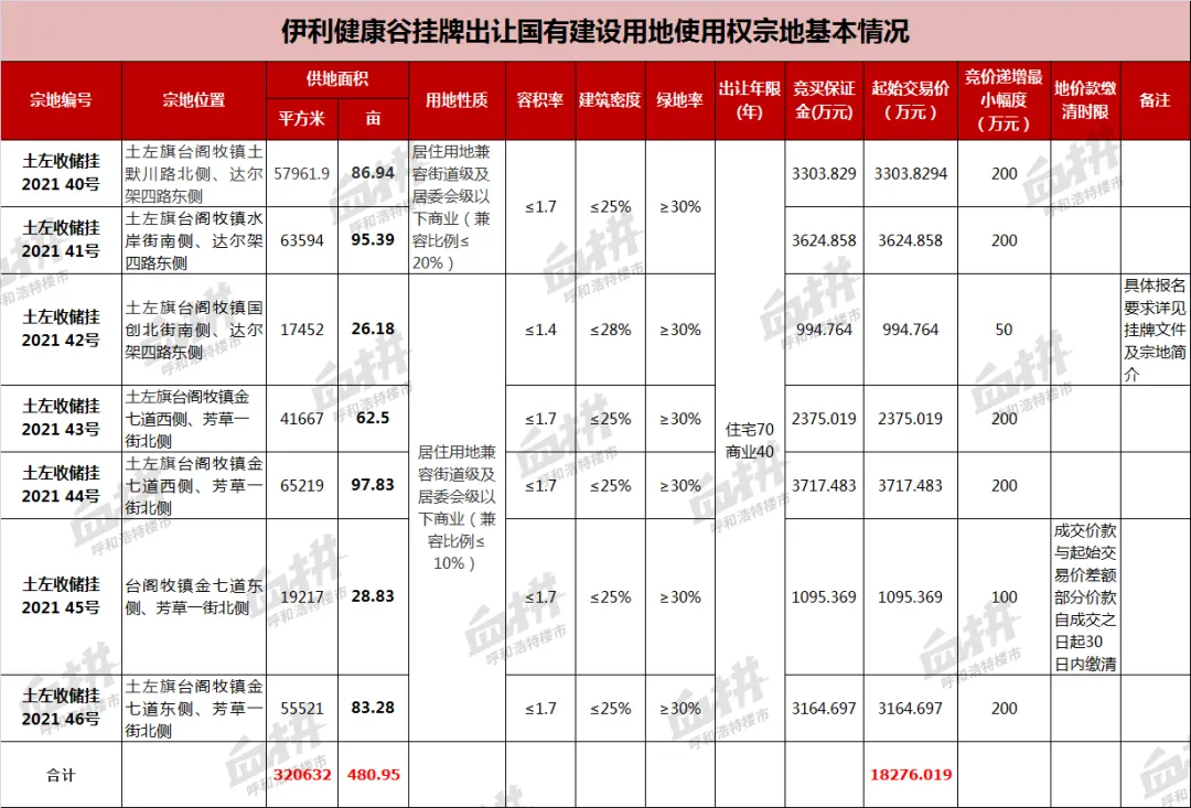呼和浩特一号工程伊利健康谷,12月10日挂牌出让7宗住宅兼容商业用地,合计480.95亩,起始交易价约1.82亿元。