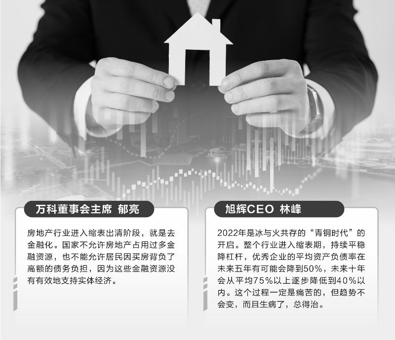 比郁亮略显乐观,林峰在去年底就提出,地产已经进入“青铜时代”,1个月后,他进一步表示,2022年是冰与火共存的“青铜时代”的开启。他同样认为,整个行业进入缩表期,持续平稳降杠杆,优秀企业的平均资产负债率在未来五年有可能会降到50%,未来十年会从平均75%以上逐步降低到40%以内。“这个过程一定是痛苦的,但趋势不会变,而且生病了,总得治。”林峰说。郁亮则把这一痛苦的过程比作吃多糖堆积脂肪后的戒糖,这个时候已经严重依赖,没有糖吃就会萎靡不振。