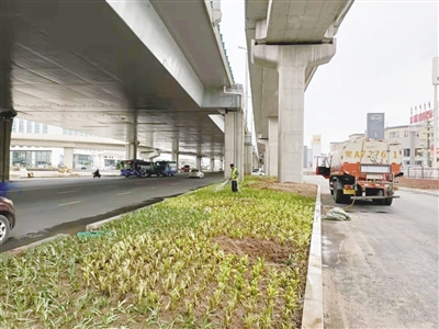 在海拉尔西街沿线采访时记者就看到,金海高架桥正下方有的隔离带进行了绿化补栽,有的地方铺设了水泥地基正在进行硬化。金海路改造提升工程指挥部工作人员告诉记者,金海高架桥下方的隔离带绝大多数区域都要进行绿化,但在金海高架桥与巴彦淖尔路高架桥交会处桥下,因阳光很难照到这里,所以这一区域会进行硬化施工。自西二环快速路向东至科尔沁高架桥之间的海拉尔大街道路恢复基本已经完成,剩余施工也将在6月30日前全部完工。