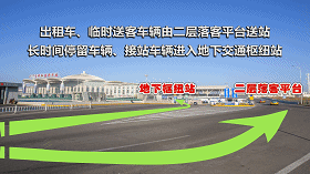 ▲旅客到达呼和浩特东站后,乘坐出租车、临时送客车辆的旅客由二层落客平台进站乘车,长时间停留、接站的车辆由站房东侧进入地下交通枢纽站内等候。