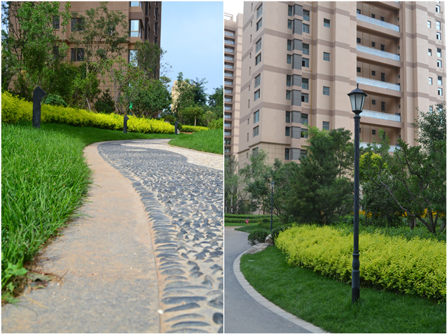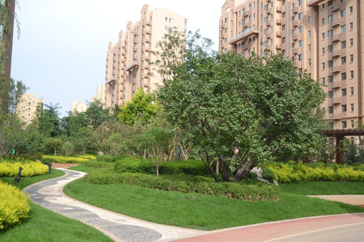城发绿园采用人车分流设计,沿人行小路深入社区腹地,看到冬青、榆树、低草、月季等形成的景观带错落有致,喷泉景台、廊架、休闲广场,以及蜿蜒在社区内的多条支干道及诸多小品,营造出一种自然而富有生活趣味的公园景观。