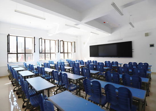 在合班教室中,阶梯式设计,可容纳252人,配备5*5米的高清拼接液晶屏以及全套的多媒体设施,立体环绕音响;在普通班级教室,课桌椅设计采用ABS一体塑胶成型技术,不易损坏,且材料环保,触屏黑板的采用,让科技与教育无缝衔接;国画书法室则采用纯国风装修设计,配备全套实木座椅,书法毛笔等设施,受到参观者的一致好评。