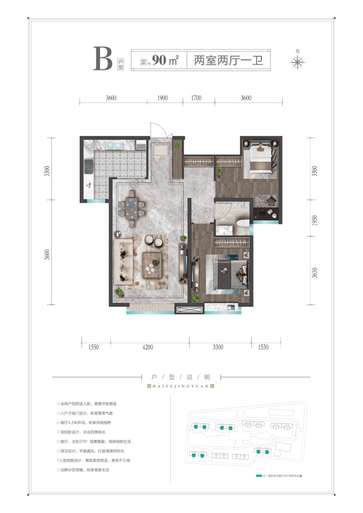 B户型(小高层) 建筑面积 :90㎡ 两室两厅一卫