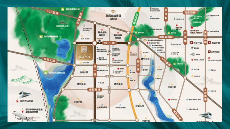 行政配套:东胜区人民政府、东胜区政务服务中心、水利局、交通局等行政资源环绕在侧。