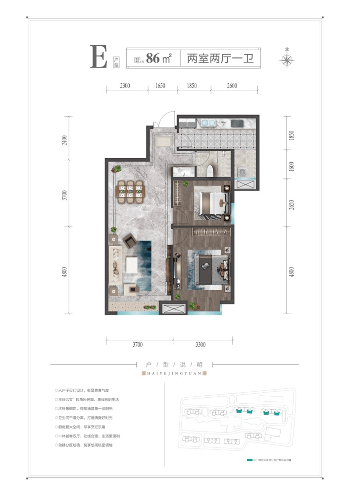 E户型(小高层 ) 建筑面积 :86㎡ 两室两厅一卫