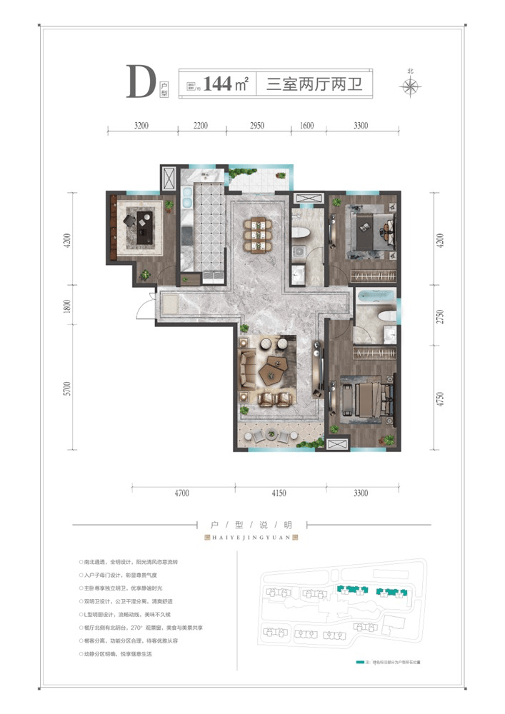 D户型(小高层 ) 建筑面积 :144㎡ 三室两厅两卫