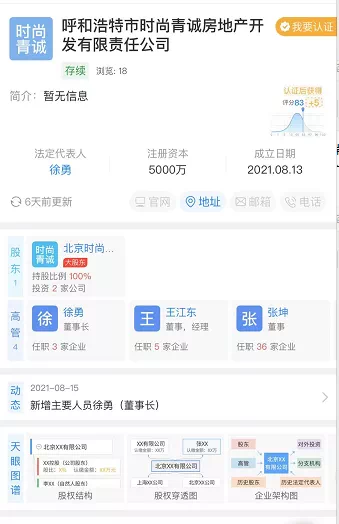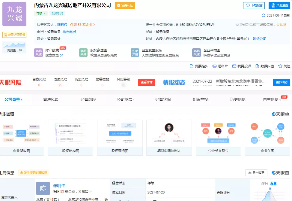 刚刚结束的第5次土地拍卖,龙湖现身呼市土地市场。从天眼查信息显示,龙湖在呼市有2个新动作。1、7月20日,龙湖注册一家名为【内蒙古九龙兴城房地产开发有限公司】的100%持股公司,注册资本100万,公司位于赛罕区。经营范围包括:房地产开发经营;各类工程建设活动;房地产经纪;物业管理;建筑材料销售;工程管理服务。