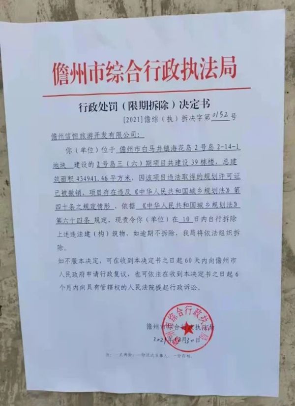 1月1日,一份海南省儋州市综合行政执法局发布的行政处罚决定书在网络流传。根据行政处罚决定书的内容,儋州信恒旅游开发有限公司位于儋州市白马井镇海花岛2号岛三(六)期项目共建设39栋楼,总建筑面积434941.46平方米,因违法取得的规划许可证已被撤销、项目存在违反《中华人民共和国城乡规划法》第四十条之规定情形,依据规定,现责令该公司在10日内自行拆除上述违法建筑物。如逾期不拆除,执法局将依法组织拆除。