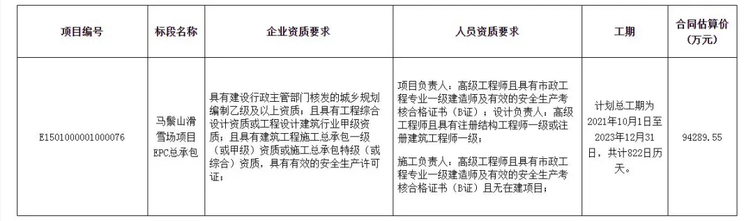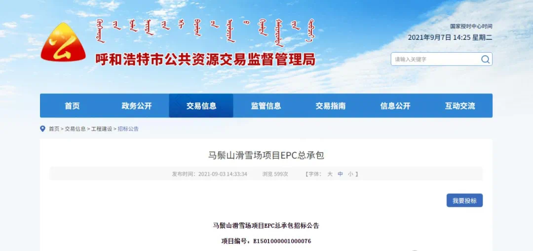 9月7日,记者从呼和浩特市公共资源交易监督管理局了解到,马鬃山滑雪场项目EPC总承包已经在呼和浩特市赛罕区住房和城乡建设局备案,具备招标条件,正对该项目进行公开招标。该工程计划投资94289.55万元,全部为国有投资。