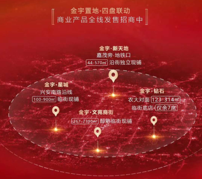 现金宇星城、金宇新天地、金宇钻石、金宇文苑商街四盘联动,商业产品全线发售招商。现在抢位,错过即无!