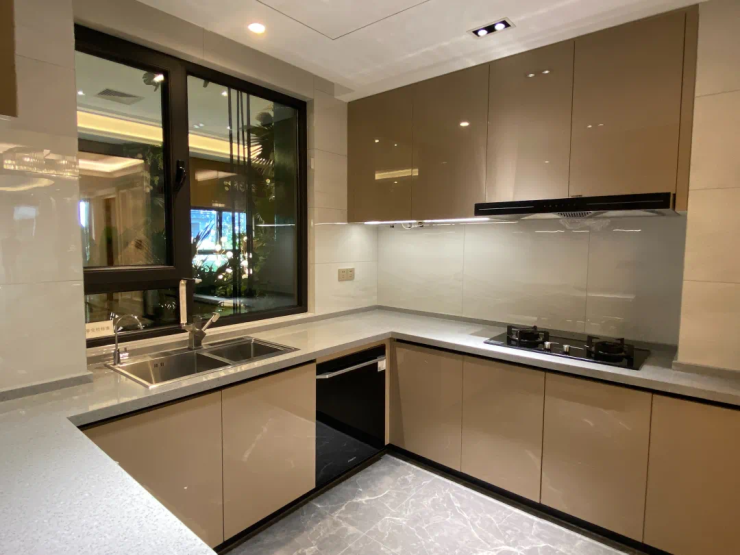 厨房与餐厅相连,经典的U型布局,利用橱具环绕三面墙壁,使冰箱、水槽、炉具形成一个正三角,实现取-洗-切-炒-盛一气呵成,烹饪更高效,让煎炒烹炸的时光成为一种美妙的享受。根据亚洲人身高订制的厨房台面、双开门冰箱空间预留等贴心人性化设计,让生活面容尽归优雅和从容。