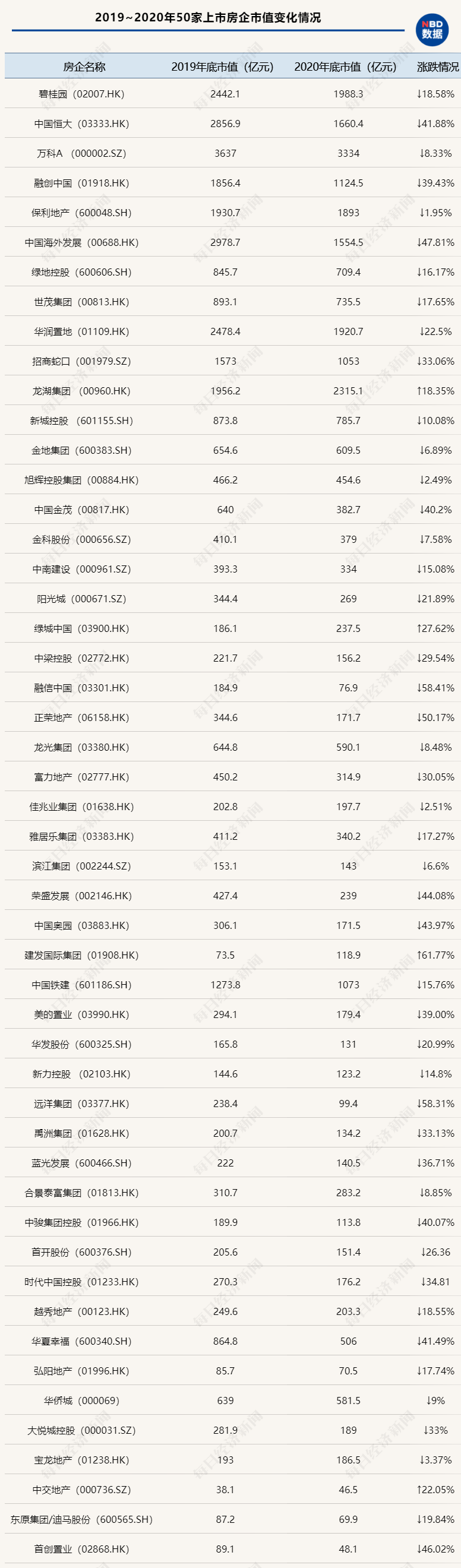 据《每日经济新闻》记者不完全统计,截至2020年12月31日,50家上市房企中有46家房企市值下降,仅有4家房企市值上升,总体市值由2019年的36881.3亿元,下跌22%至28767.1亿元,在一年时间里共缩水超过8000亿元。