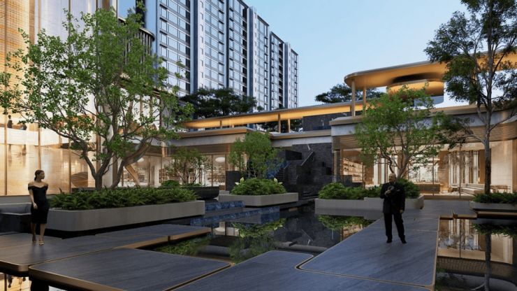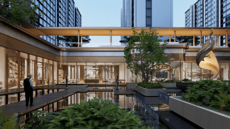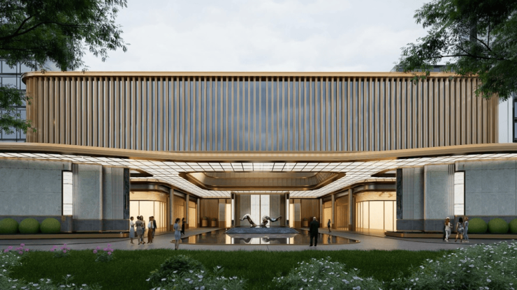 穿过落客大堂,一座名为叠翠之院的下沉庭院豁然呈现。踏入其中,仿若步入一方静谧幽境。镜面水系搭配一尊精心雕琢的雕塑,相得益彰,相映成趣 。