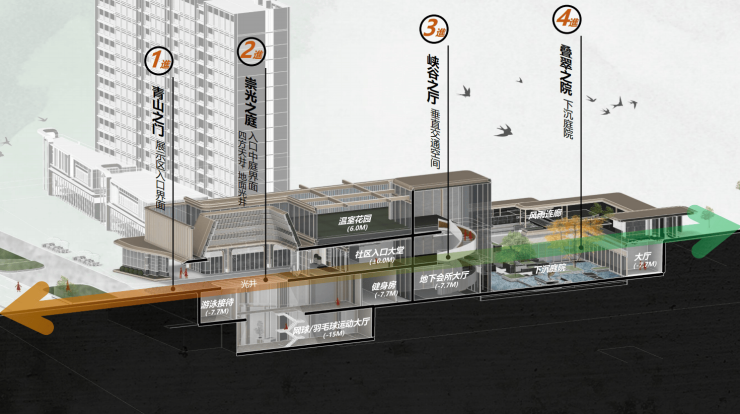 南入口中庭一方四方天井与四水归堂的布局独具匠心,寓意着四方之财汇聚于此,象征着财富与福气的积聚。天井两侧为环岛落客区,精心融入照壁文化元素,巧妙地营造出“藏而不露”的含蓄美感,让每一位归来的业主都能感受到浓厚的文化底蕴与归家的尊崇仪式感。