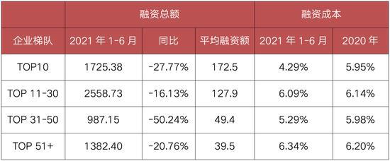 上半年融资成本下降的原因是,如招商蛇口、保利等融资成本相对较低的龙头企业发债量较多,其中境外融资成本下降1.66个百分点;同时TOP31-50房企中远洋、越秀发行了数额较大的境外债,使得该梯队房企境外融资成本下降0.73个百分点。