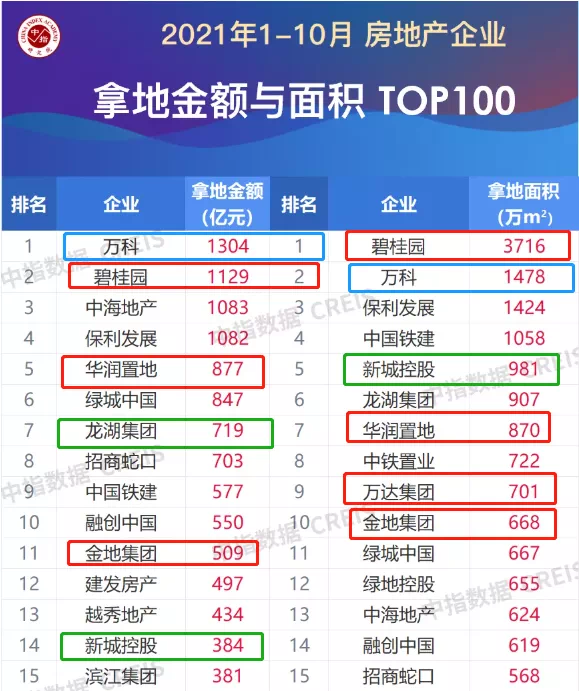近日,房地产行业权威数据机构【中指研究院】发布了2021年1-10月开发商拿地情况统计,万科拿地金额排名前列,碧桂园第二,中海地产第三,碧桂园拿地面积排名前列,万科第二,保利发展第三。