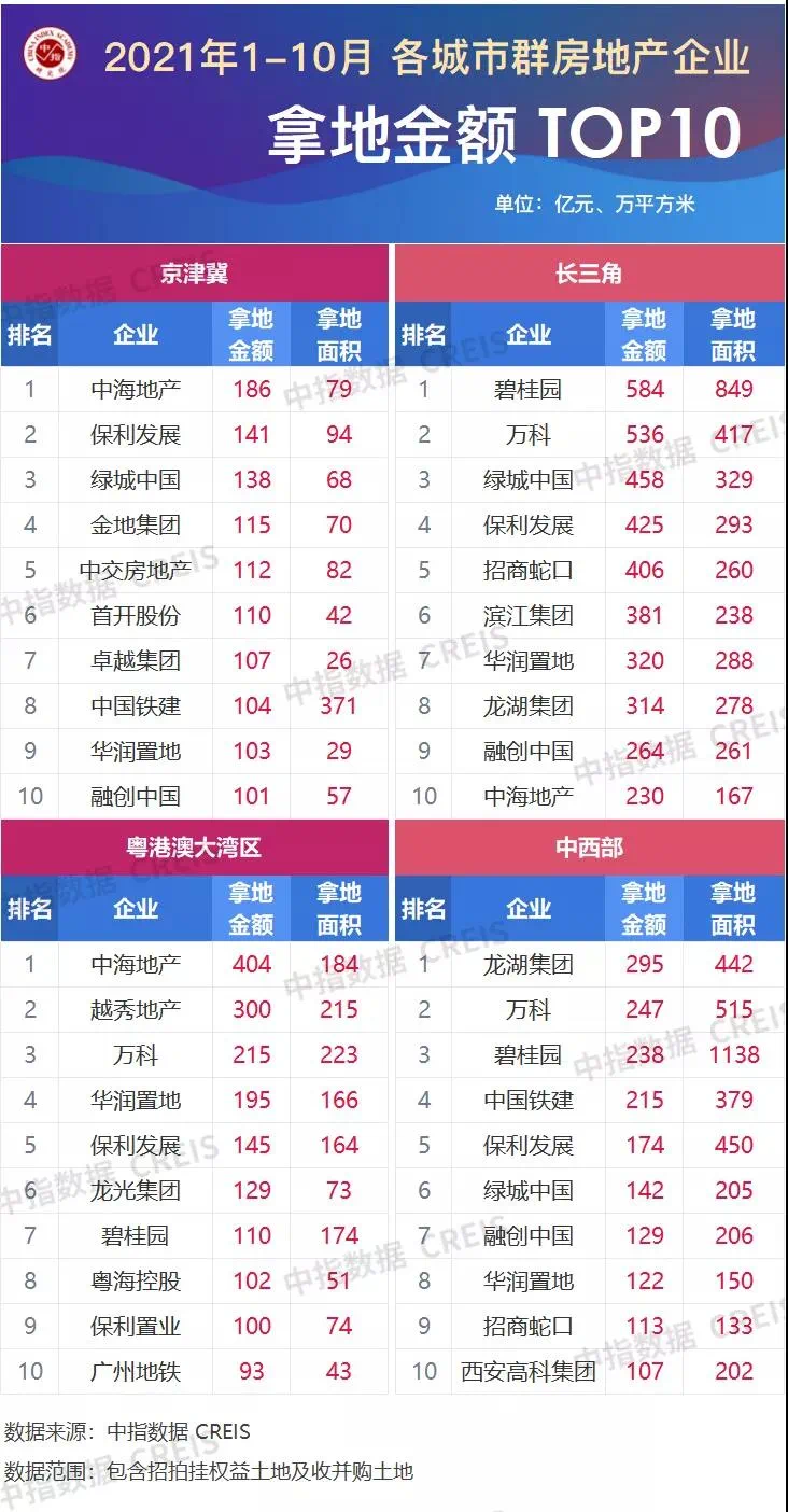 虽然今年受三道红线、融资发债收紧等影响,房企扩张速度放缓。再加上不少城市改为集中土地出让,竞争加剧,但一些绿码、黄码的开发商,仍旧在进行土地储备。根据中指的数据,2021年1-10月,TOP100企业拿地总额22549亿元,同比下降13.1%,门槛值为57亿元,与去年同期65亿元相比下降8亿元。TOP100企业招拍挂权益拿地总额占全国300城土地出让金的比例为51.8%,与1-9月相比下降1.7个百分点。今年比较明显的特征是:房企拿地布局更关注城市群,长三角城市群领跑。