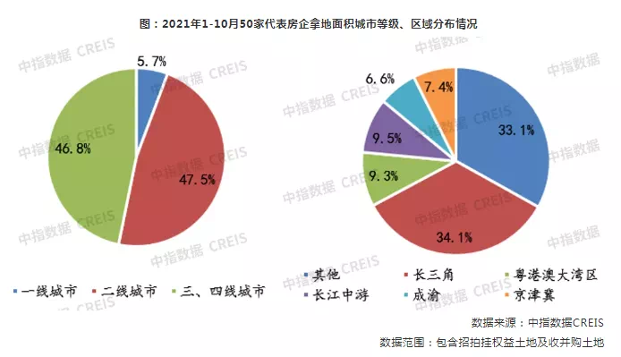 “受集中供地城市影响,一、三四线城市拿地面积占比上升。从城市等级分布来看,50家代表房企2021年1-10月在一线和三四线城市投资面积占比上涨,主要受集中供地城市影响。其中一线城市拿地面积占比上升1.4个百分点,三四线城市拿地面积上升3.1个百分点。从城市群分布来看,1-10月50家代表房企在长三角、粤港澳、成渝、京津冀城市群拿地面积占比均有所上升,房企拿地关注热点区域城市趋势显著。”