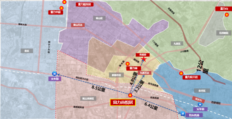 项目10分钟生活圈覆盖九原万达广场、九原特色美食街横竖街,赛罕塔拉湿地公园;7.6km包头市政府大楼、社保局、市政服务大厅,五星级铂尔曼酒店;8.3km包头大剧院、包头科技馆、包头奥林匹克中心、国际会展中心,包头世纪鹿园。项目北临14.5万㎡大型水景健康主题公园,南临小白河国家湿地公园及大型农产品批发物流市场(润恒诚);西邻滨河购物广场、包头市蒙中医院、稀土高新区管委会;东临南海湿地公园,经210国道机场高速仅11km。