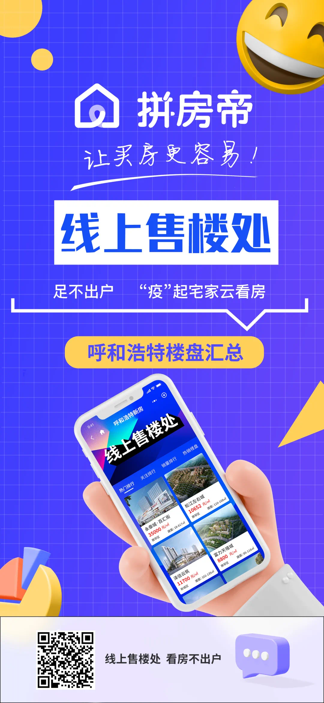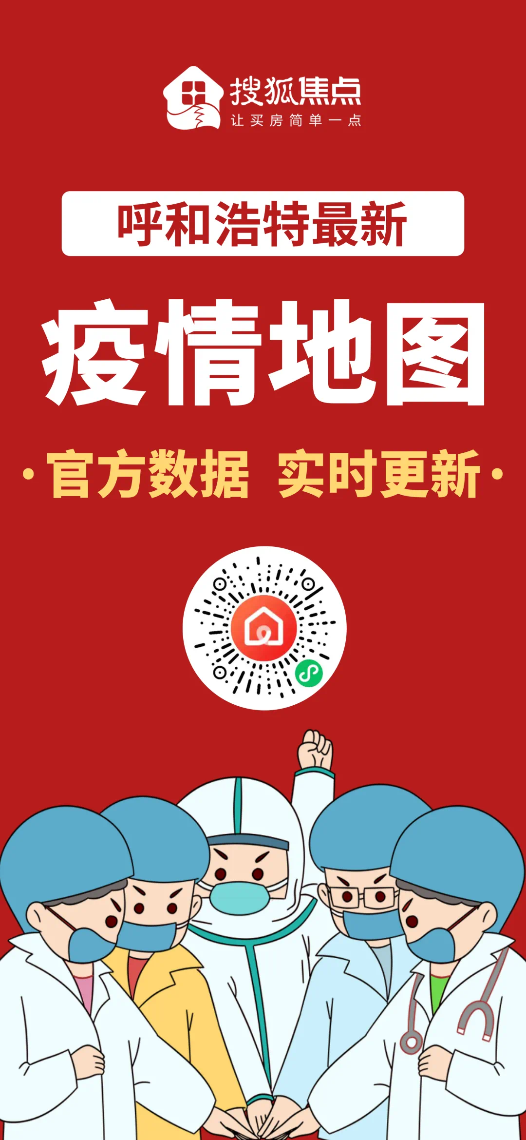 上周五,呼和浩特发现新冠肺炎疫情,周六宣布3人确诊,全市进入抗疫模式。目前排名前列轮全民核酸检测已经基本完成,核酸结果可以在检测前登记过信息的【迪安】或【金域】小程序里查询。为了方便大家更好得了解疫情进度、确诊患者轨迹,血拼哥家的拼房帝小程序,上线了【疫情地图】,大家可以扫码查看疫情的相关信息。我们倡议疫情期间遵守防控措施,减少聚集,做好个人防护,如果你正在看房、买房,也可以通过【线上售楼部】查询楼盘的位置、户型、价格、VR样板间、在线咨询置业顾问等。