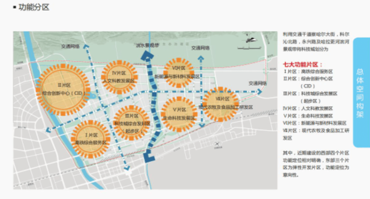 功能分区:高铁综合服务区、综合创新中心、人文科教发展区、科技城综合发展区、新能源与新材料发展区、生命科学发展区、现代农牧及食品加工研发区;